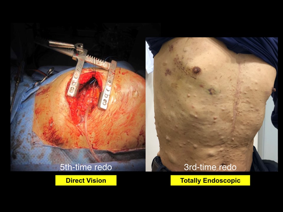 Methods : Between May 2018 and June 2019, we performed aortic no-touch totally endoscopic redo mitral valve surgery on 25 patients; second-time in 19 patients, third-time in three patients, fourth-time in three patients. All patients had undergone previous valve surgeries involving mitral valves only through sternotomy approach (EuroScore II 12.92±10.64%). Previously implanted prosthetic aortic valves existed in nine patients. All procedures were performed through 5-6cm right minithoracotomy incision with two extra ports; a left atrial sump drain and a 10 mm-scope trocar (Frigure, Right). Left atrium was opened after inducing FA with a fibrillator.