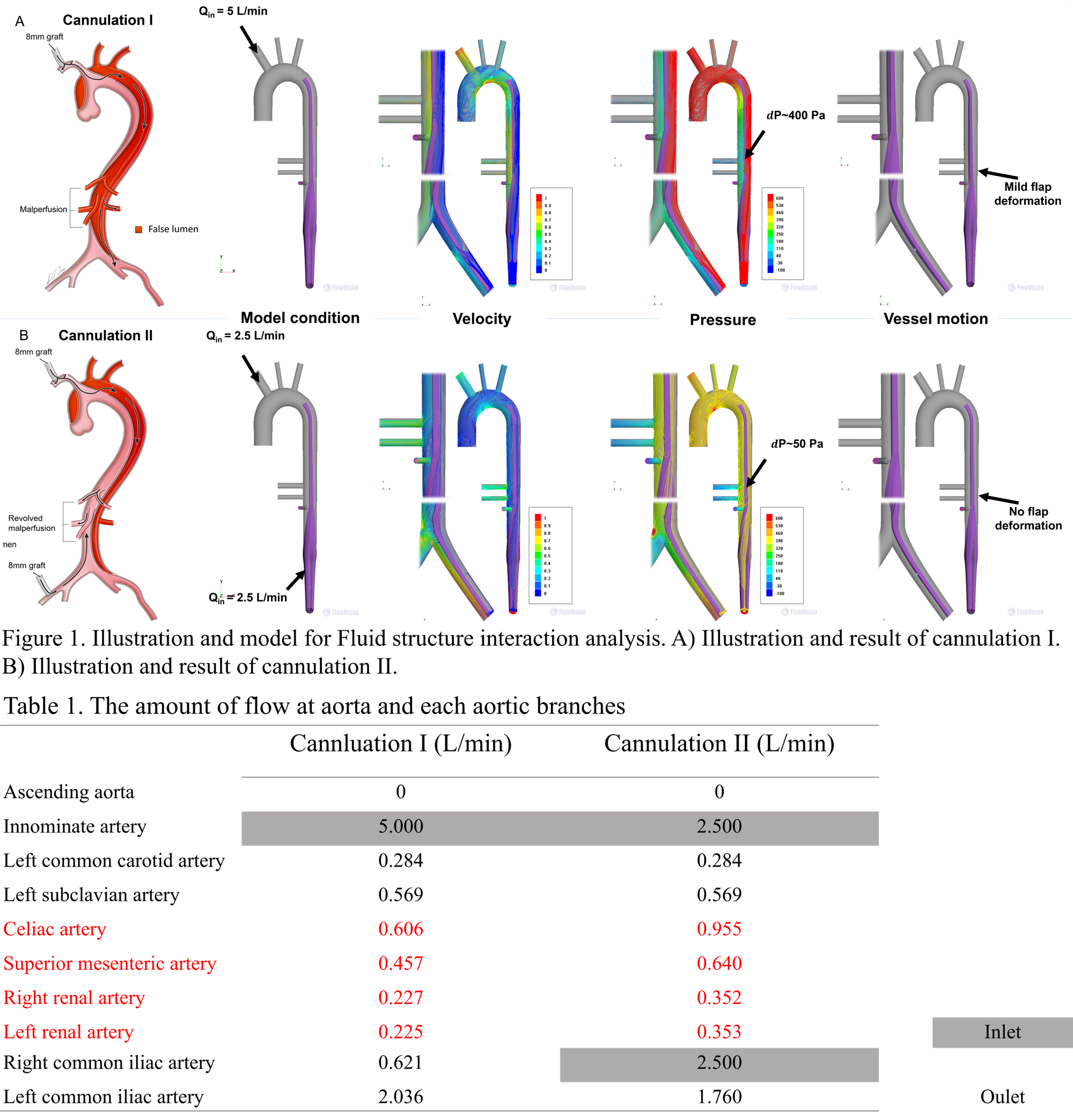Methods : The model was made assuming the visceral malperfusion in aortic dissection. Two cases of Fluid-structural interaction analysis were conducted with this model. The first case has innominate artery (IA) cannulation (cannulation I), and the second case has dual (IA and femoral) cannulation (cannulation II). In analysis, the the inlet conditions were given to IA at 5L/min for the cannulation I, and the IA and femoral artery at 2.5L/min each for the cannulation II