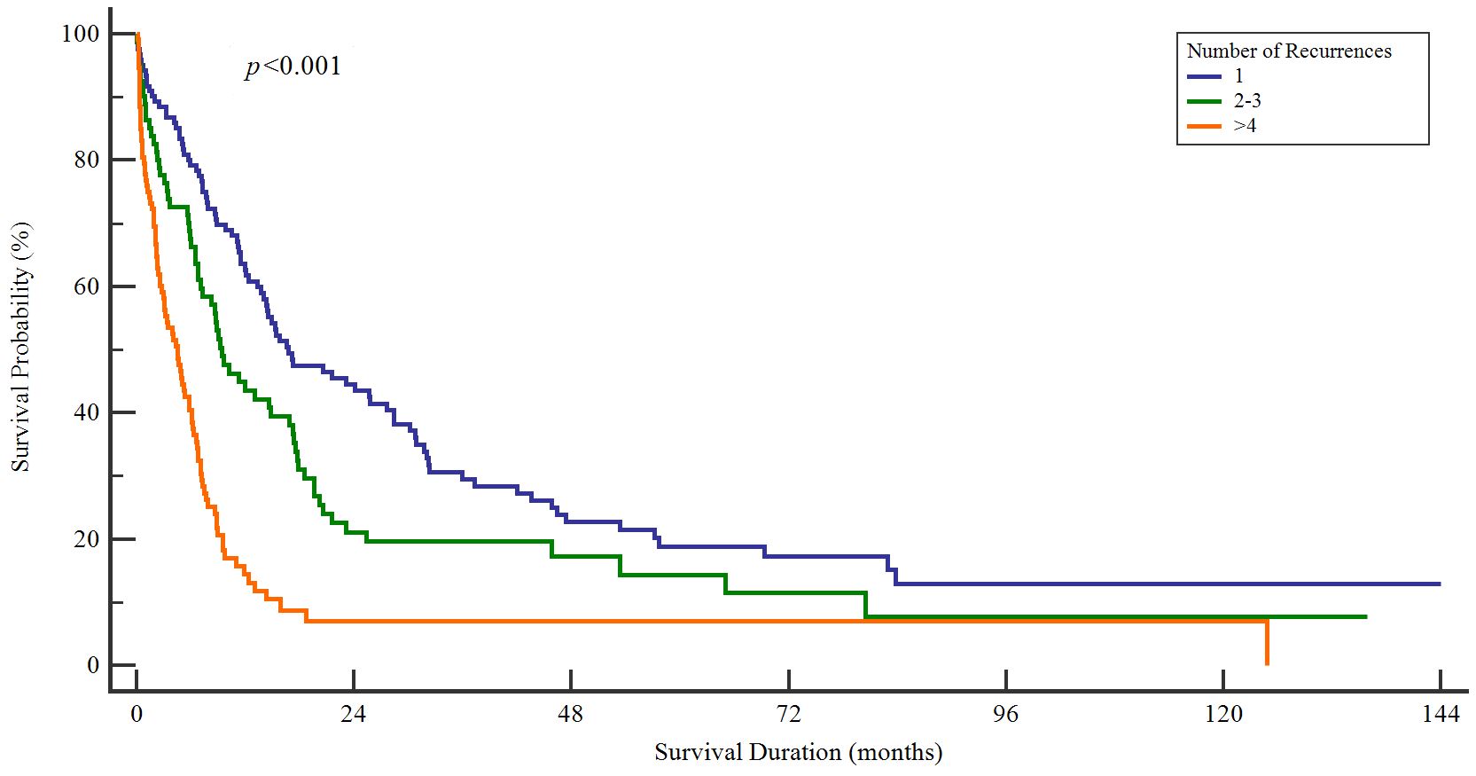 Results : The mean age of the patients was 63.8±8.1 years and most of them were male patients (n=313, 97.5%). The median time to recurrence was 10.7months and the median survival time after recurrence was 7.3months. Local recurrences were identified in 46patients (14.3%) and regional recurrences in 211patients (65.7%), however, multiple recurrences with concurrent local, regional and distant locations were common (n=120, 37.4%). In terms of the number of recurrence, single recurrence was the most common (n=123, 38.3%) with highest survival (median 16.7months, p<0.001). Double and triple recurrences showed similar survival and higher survival than the recurrences with four or more (n=82, median 9.4months, p<0.001). The survival rate among the patients with four or more recurrences didn’t show any difference (Figure 1). In multivariate analysis, number of recurrences, lymph node involvement and adjuvant therapy were the significant factors of post-recurrence survival (p<0.05).