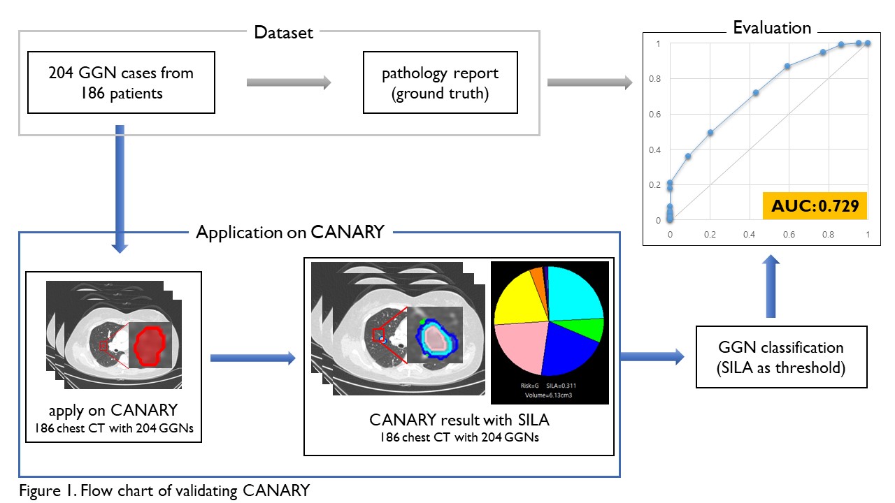 Methods : A total of 186 chest computed tomography (CT) sets are used and all patients underwent lung resection surgery between 2018 and 2019. 204 GGN cases from these patients were identified as 160 of invasive adenocarcinomas or 44 were ‘indolent’ (AAH, AIS, or MIA), based on the pathology report in our institution. With lesion area confirmation of thoracic surgeon, the Score Indicative of Lung cancer Aggression (SILA) from CANARY was calculated and evaluated to classify GGN as invasive or indolent.