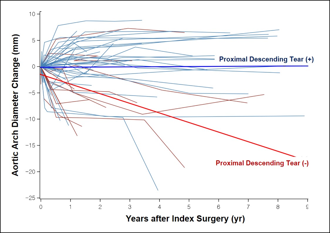 Results : The mean of baseline maximal arch diameter was 36.5±3.8 mm. During median follow-up of 46.5 (interquartile range, 12.9-94.4) months, a significant arch expansion was detected in 22 (31.0%) patients. On multivariable risk analyses, the presence of intimal tear in the proximal descending aorta (HR 1.36, 95%CI 1.06-1.76, p=0.02) and in the arch vessels (HR 1.39, 95%CI 1.02-1.89, p=0.04) emerged as independent factors for the significant arch expansion. Estimated yearly expansion rates were 0.03±0.23mm/year and -1.83±0.45mm/year in patients with and without proximal descending tear, respectively (Figure, p<0.001). Among overall 71 patients, 13 (5.39%/ patient-years) secondary outcomes occurred. Meanwhile, three (8.4%) early adverse events were observed in patients with initial total arch replacement.
