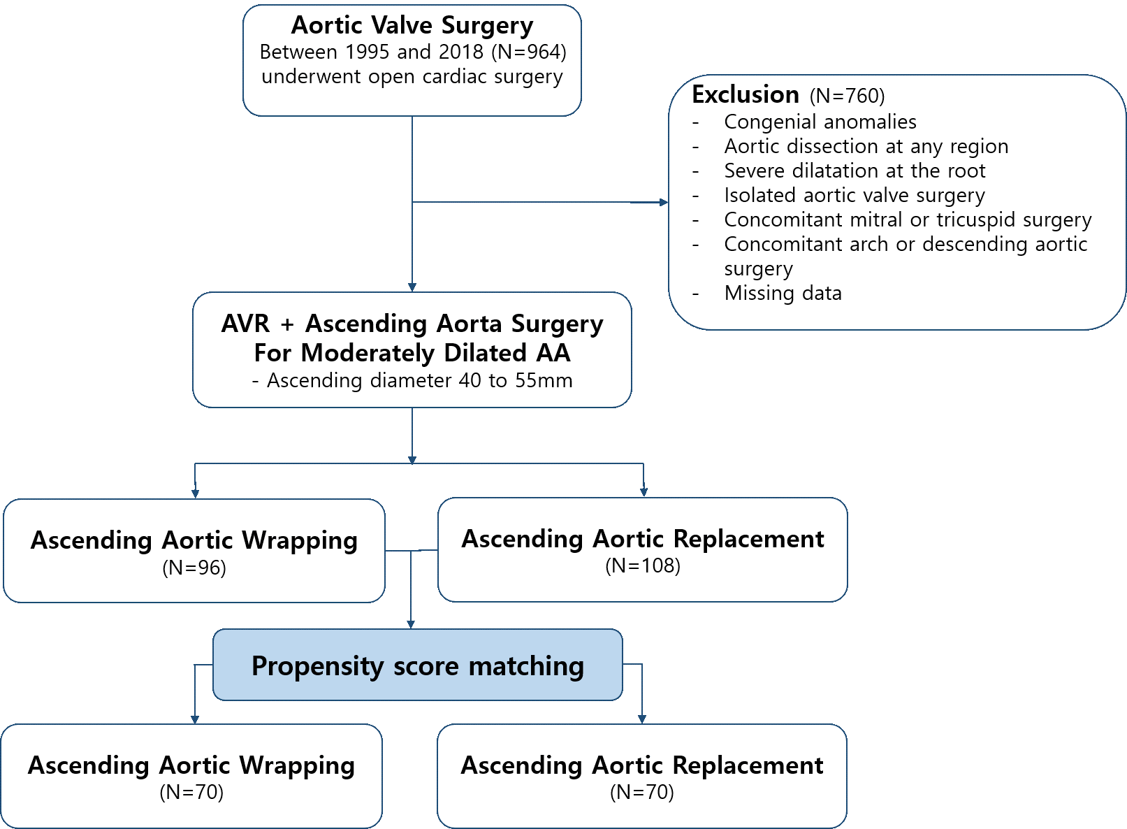 Methods : From January 1995 to December 2018, 964 consecutive patients who underwent aortic valve replacement at our institution were reviewed. Of them, 204 (mean age 60.7±7.4 years) underwent ascending aorta wrapping (n=96) or replacement (n=108) for moderately dilated ascending aorta (40 to 55 mm). The overall fate of the aortic diameter was analyzed with a linear mixed-effect model. The median follow-up duration was 7.1 years.