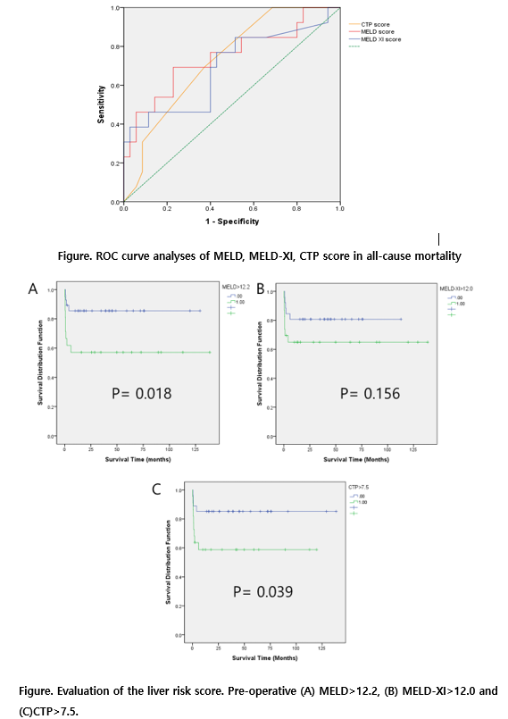 Results : Causes of heart failure were dilated cardiomyopathy in 26, ischemic disease in 7, congenital heart disease in 6 and valvular heart disease 7 patients. Cause of liver cirrhosis was majority of cardiac origin, except hepatitis in two and alcoholism in one patient. The median follow-up duration was 45.2 months. The MELD score (p=0.010) and MELD-XI score (p=<0.001) were significantly differed between survivors and non-survivors. Cox regression analysis showed high MELD score (HR 1.211; 95% CI, 1.059-1.386; p=0.005), MELD-XI score (HR, 1.184; 95% CI, 1.042-1.345; p=0.010) and CTP score (HR, 1.694; 95% CI, 1.040-2.760; p=0.034) were associated with the risk of all-cause mortality. Receiver operating characteristic (ROC) curve analysis revealed the optimal cut-off value of MELD, MELD-XI and CTP score was 12.2, 12.0 and 7.5, respectively (sensitivity: 69.2 vs. 61.5 vs. 69.2%, specificity 68.6 vs. 60.0 vs. 62.9%) for all-cause mortality (AUC: 0.745 vs. 0.690, 0.729).