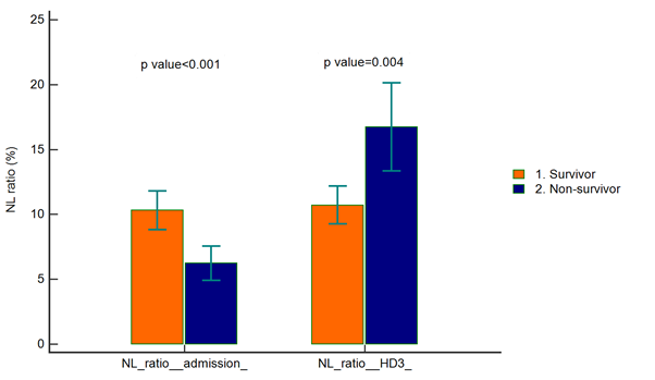 Initial NL ratio was statistically lower in matched survival patients, compared to matched non-survival patients (9.1±8.1 versus 4.7±5.2. p value<0.001), and the value was reversed after 3 days (9.6±7.6 versus 17.7±13.9. p-value=0.004). The cut‐off value for initial NLR and NLR after 3 days were 5.6 and 9.7, respectively. Logistic regression analysis demonstrated that initial NLR (<5.6) was independently associated with in-hospital mortality (odds ratio: 0.89, 95% confidential interval: 0.86-0.93, p-value<0.001)