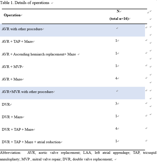 Results : A total of 16 patients (66.1±10.0 years; 9 females) underwent the mini-access combined AVR from January 2018 to August 2020. Baseline EuroSCORE II was Euroscore 2.6 (IQR 1.8-3.7). AVR+mitral valve replacement was performed in 9 patients (56.3 %), and details of operation are listed in Table 1. A sutureless/rapid-deployment AVR was used in 5 patients (31.3 %). Mean aortic cross-clamping and cardiopulmonary bypass times were 107.7 ± 38.9 min and 156.8 ± 51.7 min, respectively. There was no early mortality, postoperative neurologic injury, low-cardiac output syndrome or new-dialysis, however, 1 patient (6.25 %) required reoperation for bleeding. The median length of stays in intensive care unit and hospitalization were 1 day (interquartile range (IQR), 1.00-1.25 days), and 8 days (IQR, 6.75-10 days), respectively.
