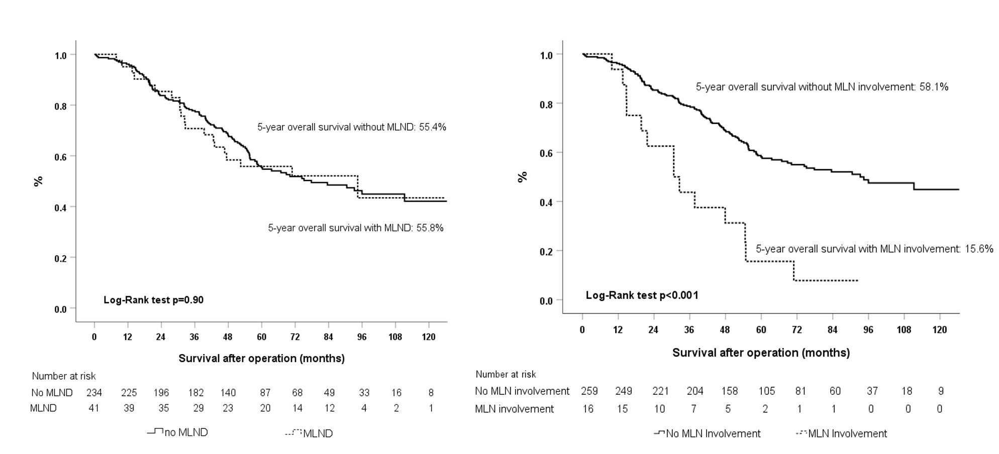 Results : The mean age was 60.9 ± 11.6 years and male was 165 (60%). The median numbers of metastatic nodule was 2 (range, 1-17), Numbers of patients who have solitary, two, and more than 3 were 130 (47.3%), 58 (21.5%), and 86 (31.3%), respectively. The mean size of the largest metastatic nodule was 1.5 ± 0.9 cm. MLND was done in 41 (14.9%) patients. There was no difference in 5‐year OS (MLND+ 55.8% vs LND− 55.4%; p=0.9) between the two groups. Nineteen nine (36.0%) patients have more than 5 (normal level) of preoperative carcinoembryonic antigen (CEA), and mediastinal lymph node involvement was found in 16 (5.8%). On multivariate analysis, preoperative CEA level (p<0.001), greater number of metastatic nodules (p=0.016), size of the largest metastatic nodule (p=0.005), and lymph node involvement (p=0.008) were negative prognostic factor of OS.