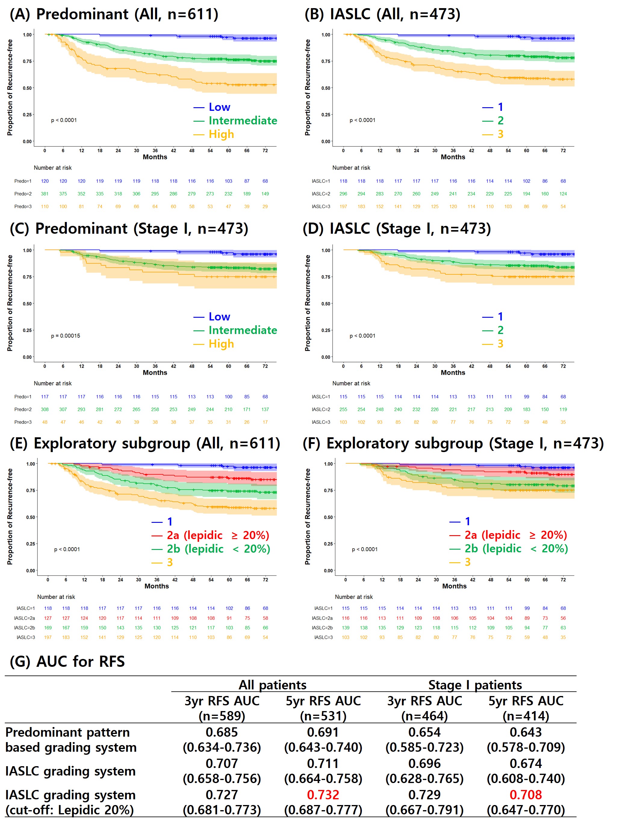 Results : Analysis of recurrence-free survival (RFS) revealed that the newly proposed IASLC grading system (AUC= 0.711) for invasive pulmonary adenocarcinoma has better discriminatory ability than the previous predominant pattern-based grading system (AUC= 0.691). In the stage I patients, the stratification of survival between the 3 grades was more evident with the IASLC grading system than the predominant pattern-based grading system (p < 0.0001 versus p= 0.00015, AUC= 0.674 versus AUC= 0.643). Furthermore, the IASLC grading system group 2 patients still have prognostic heterogeneity. The discriminatory ability can be improved by applying a 20% cutoff to the lepidic pattern of group 2 patients (AUC= 0.732).