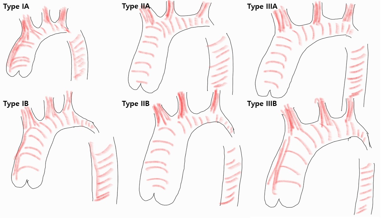 Methods : A retrospective clinical review of the patients with CoA undergoing surgery between March 2011 and August 2020 was performed. We devise a surgical classification to separate various entities in the spectrum of CoA: type I= tightly packed all three head vessels; type II= left subclavian artery separated from two other head vessels; type III= all three head vessels separated from each other. Each of these types has subtypes: A= without long isthmic portion and B= with long isthmic portion.