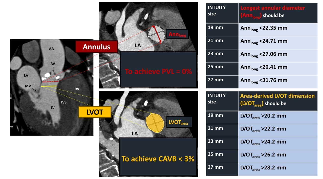 Methods : We analyzed 187 patients who had undergone preoperative multi-detector computed tomographic (CT) evaluation and RDAVR using INTUITY between Feb 2016 and Dec 2019. CAVB requiring permanent pacemaker implantation (PMI) and PVL (≥mild) were outcomes of interest. The relative size of implants as opposed to cross-sectional dimensions of recipients’ AV annulus and left ventricular outflow tract (LVOT) were calculated.