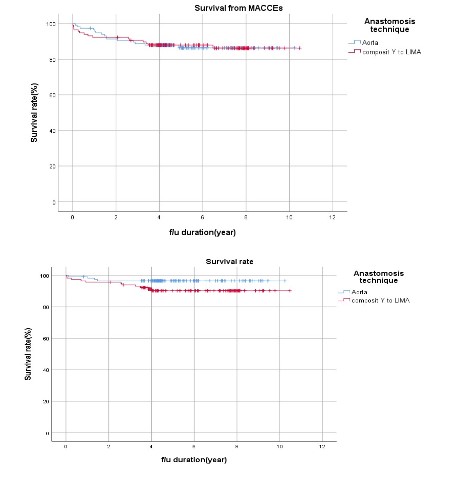 Results : The baseline characteristics were different between the groups. So the propensity score matching was done and 234 patients were enrolled. Kaplan-Meier analysis was done and the 10-year freedom from MACCEs rate revealed no significant difference between the groups (86.4±3.3% in Ao group vs. 86.2±3.4% in Y group, p =0.992). But the 10-year survival was significantly different between the groups (96.6±1.7% in Ao group vs. 90.3±2.8% in Y group, p=0.069). Cox-regression multivariate analysis was performed and the anastomosis technique was not associated with overall MACCEs (HR=0.911, 95% CI:0.500-1.659, p=0.761) but associated with survival rate (HR=2.463, 95% CI:1.026-5.915, p=0.044)