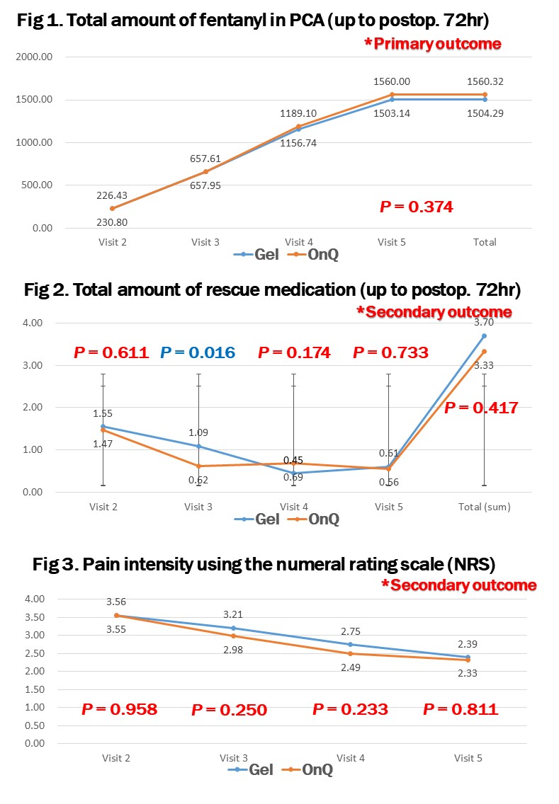 Results : Both groups showed no difference in terms of age, sex, disease entity, operation time, chest tube indwelling time, and hospital stay. No statistically significant differences in the total postoperative fentanyl consumption were observed for the two groups (Gel group; 1504.29 ± 315.72, On-Q group; 1560.32 ± 274.81, p = 0.374). Pain intensity using the numeral rating scale (NRS) between the Gel and On-Q groups demonstrated no statistical differences (postoperative 6 hour; p = 0.958, 24 hour; p = 0.250, 48 hour; p = 0233, and 72 hour; p = 0.8110), and there was no statistically significant difference in frequency of analgesic rescue medication use (p = 0.417).