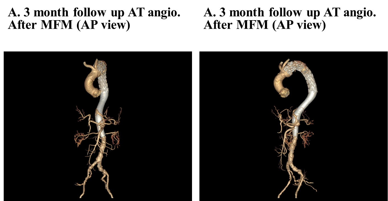 MFM landed 5 cm distally at the level of the superior mesenteric artery (SMA) and 2nd and 3rd MFM landed proximally at the middle level of the previous TEVAR stent-graft. All branches were perfused and patent.