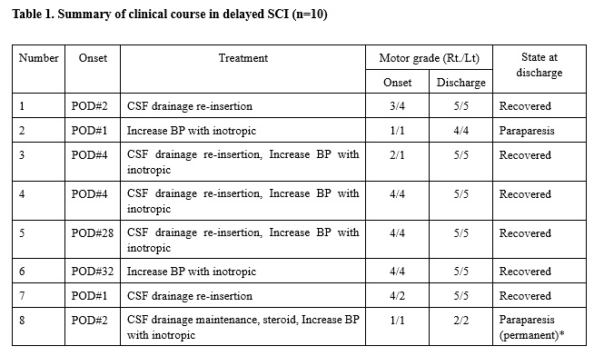 Results : The mean age was 55±16.2 years in total group and median follow up period was 40.5 (range: 0~252) months. The median duration for onset of delayed SCI was 2 (range: 1~32) days. Six patients (75%) were recovered after adequate treatment. One patient (12.5%) were able to walk with a cane at discharge and recovered gradually. Meanwhile, one patient (10%) was transferred for rehabilitation with persistent paraparesis. (Table1.)