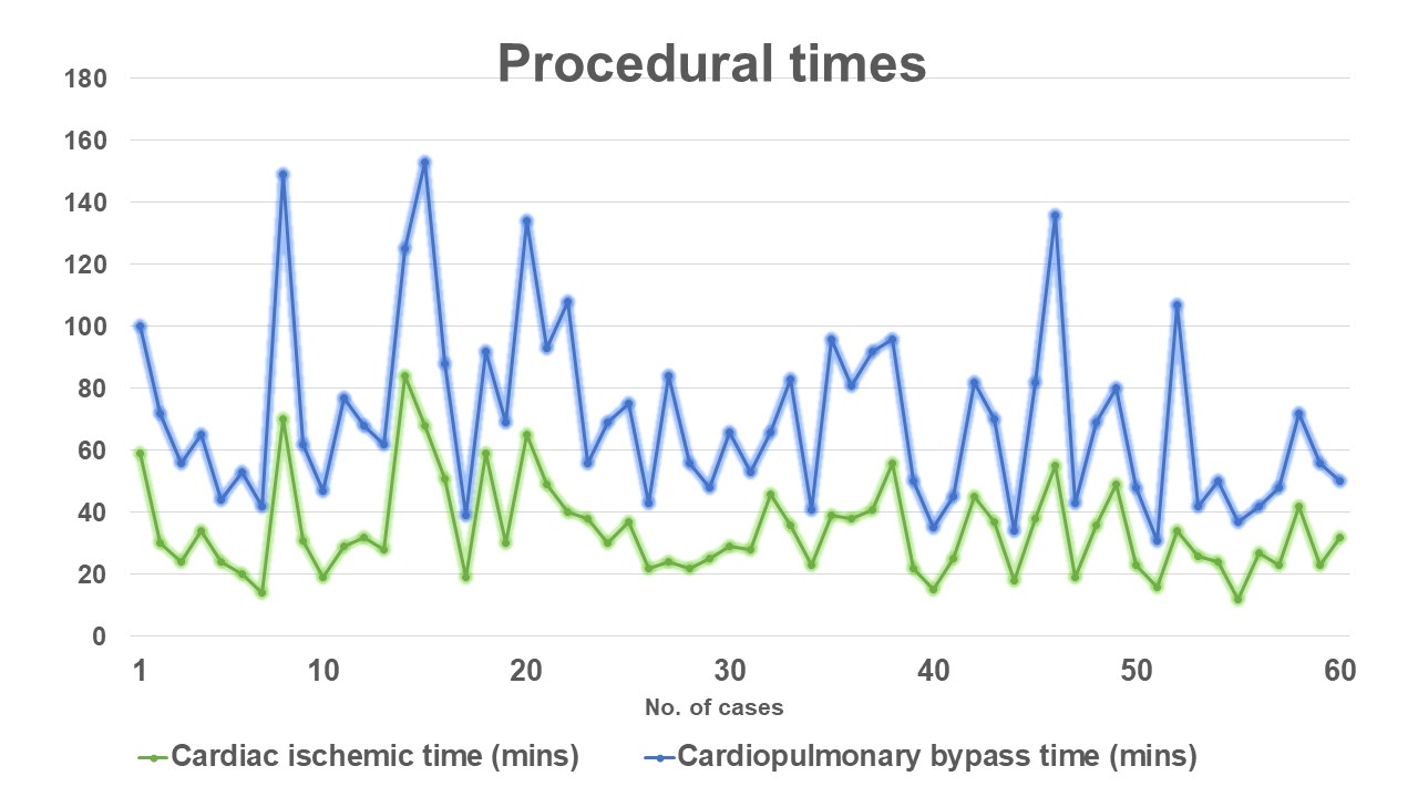 Methods : From October 2008 to July 2020, we retrospectively reviewed 60 patients (mean age 56.0±12.1 years, 40 females). We conducted femoral cannulation and antegrade cardioplegic arrest in all patients. The patients’ characteristics and the perioperative data, including brain diffusion-weighted magnetic resonance image (DWI) were collected. Follow-up echocardiograpram was obtained annually.
